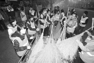 近日,天还未亮,青岛一群20岁左右的大学生,与环卫工人一起体验生活 何毅 摄