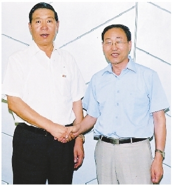 省劳模协会常务副会长卢其松(右)会见热心劳模事业先进个人、全国劳模、延安王家坪实业发展集团总经理王西林