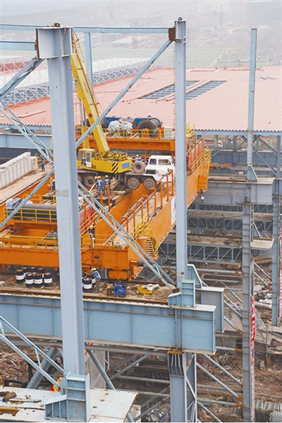 重钢建设公司突击队在环保搬迁炼钢工程劳动竞赛中,创造性地实现了以行车大梁为平台、吊装超高厂房钢结筳。