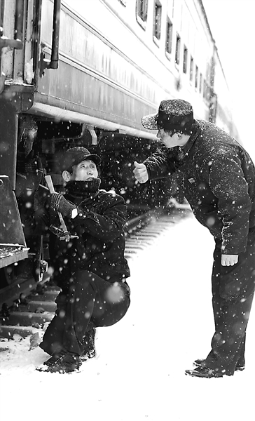 1月18日,在江西九江市铁路客车技术整备站,南昌车辆段的工作人员正在风雪中对客车进行防断检查。当日,一场大雪突降九江,市民出行受到影响,当地铁路部门迅速做好车辆防断检查和餐车食品供应工作,确保春运安全畅通。胡国林 杜勒彪 摄
