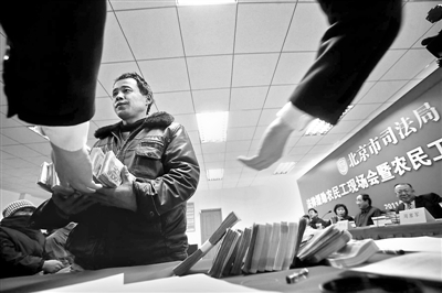 据了解,近3年来农民工法律援助案件占北京市法律援助案件总数的60%以上。仅2010年北京市就已办理农民工案件近9000件,涉及金额1.6亿元。杨威 摄