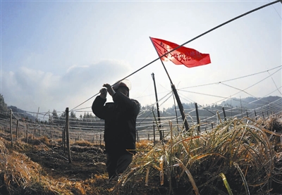 1月21日,在广西桂林市资源县中锋乡长冲村,广西水利电业集团公司工人正在拉电线,准备抢修线路。新华社记者 周华 摄
