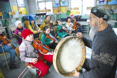 1月20日,新疆库车县第二小学教室内,音乐老师正为留守的孩子们辅导小提琴演奏技巧。