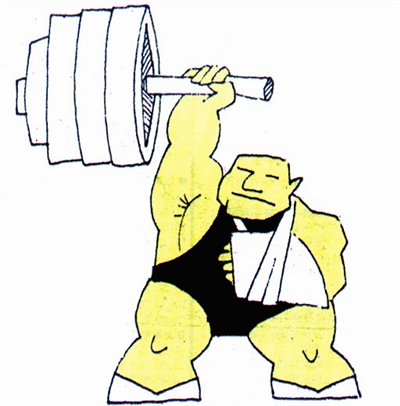 举重健将左手受伤,毫无气馁的神色,他排除万难竟用右臂挺举起“半壁江山”!我们为运动场上这种永不言败的精神叫好。