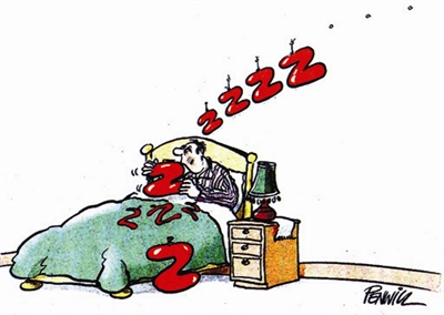 失眠者的痛苦是常人难以想像的。这位先生躺在床上,眼巴巴地渴望着熟睡……他一旦美梦成真,那将是多么幸福的一天。