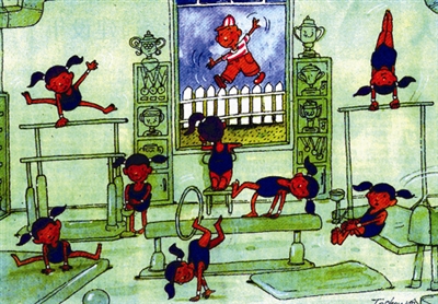 这里是孩子们运动的天堂,练功房内外都那么精彩。画面上娃娃们动作率真、情趣盎然,作者无疑是位喜爱孩子的漫画家。