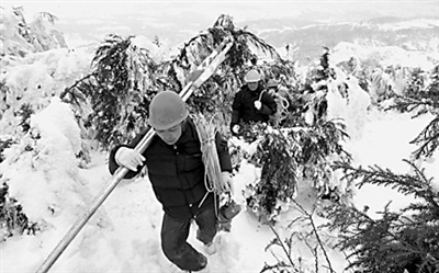 1月20日,抢险人员冒着严寒在冰雪覆盖的滇东北山地中作业。目前,5000多名专业人员已投入滇东北保电救灾工作。新华社记者 陈海宁摄
