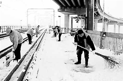 1月20日,在九江长江大桥上,九江桥工段的职工正在打冰扫雪。当日,江西九江继续普降大雪,京九铁路九江段出现严重积雪和冰冻现象,南昌铁路局九江地区的职工积极对京九铁路正线道岔区和九江长江铁路桥等重点部位开展除冰铲雪,确保京九铁路交通大动脉的安全畅通。胡国林 李园霖 摄