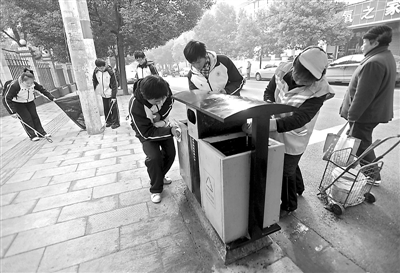 当日,武汉中学组织100余名学生分别前往福利院陪老人过周末、到街头体验环卫工人的劳动生活,上了一堂生动的社会实践课。 新华社发(史伟 摄)