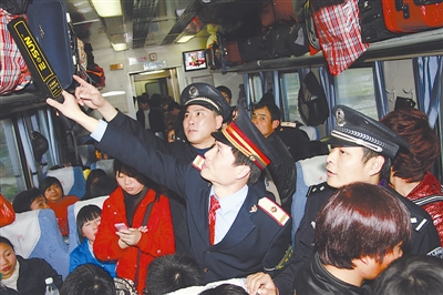 福建厦门乘警支队泉州队,对泉州东至武昌的398/7次“农民工专列”,开展送平安进车厢活动,受到农民工好评。图为列车长、检车长、乘警“三乘一体”的安全巡检,进行防火、防盗安全巡视。甘洋和 摄