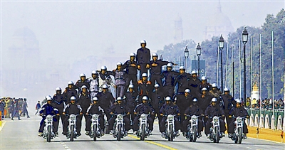 印度为庆祝共和日将于1月26日在新德里举行阅兵游行。从1月20日开始,印度军方进行了不间断的多次阅兵彩排。图为士兵在首都新德里大街上彩排的场景。阿健 供图