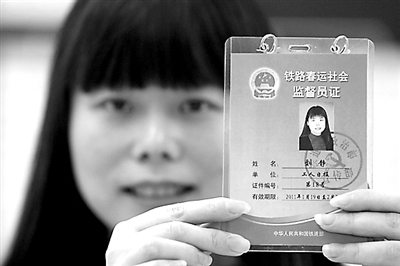 1月24日,工人日报记者在展示她的铁路春运社会监督员证。