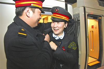 尹小津(右)是济南客运段动车队北京线路列车长,从1997年起,她就与春运有了不解之缘。自2007年和谐号动车组开行至今,她一直与“中国速度”共同成长,同时在为乘客服务中,不断丰富着“泉韵”服务品牌。