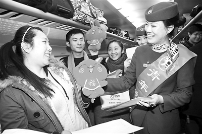 青年志愿者在为幸运旅客送上吉祥兔。春运第一天,郑州客运段组织青年志愿者到D134动车组上征求旅客意见。志愿者从列车服务的每一个细节入手,采取问卷调查、开门评车、与旅客座谈等多种方式掌握旅客需求,适时调整列车服务重点,提升客运服务质量,为旅客营造一个温暖和谐的乘车环境。张强 刘钰龙 摄