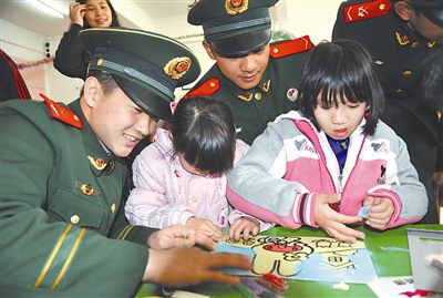 1月24日,中山边防官兵与福利院的孤儿一起画画。春节将至,广东中山边防支队勤务中队官兵来到驻地儿童福利院开展“集体认亲送温暖”活动。官兵们与孤儿结成一对一的帮扶对子,从精神上关爱孩子们,让他们感受到爱的温暖。