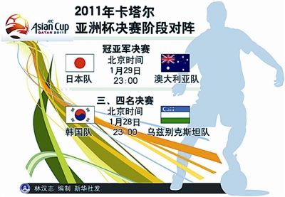 北京时间1月26日凌晨,2011年亚洲杯足球赛进入了半决赛的争夺。经过两场惊心动魄的比赛,日本队通过点球大战5比2淘汰韩国队,澳大利亚队6比0大胜乌兹别克斯坦队,双双挺进决赛。