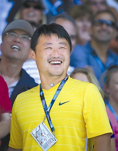 1月27日,李娜的丈夫兼教练姜山在看台上为妻子的胜利而高兴。新华社记者 陈铎 摄