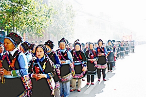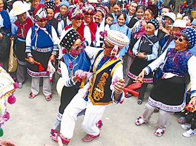 <习俗> 绕三灵队伍多以村为单位,队伍分为三部分:前队,有一男一女两位老人,称“花柳树老人”,头缠大白包头,身穿雪白对襟衣,着彩色绸裤,脚穿缀有红绒球的彩线凉鞋,打扮得十分风趣,二人共扶一枝杨柳,柳枝上挂一只葫芦和一块彩绸,一人执牦牛尾拂尘,一人执红扇或甩白毛巾,二人边舞边对唱白族“花柳曲”,一人主唱,一人打趣,唱词幽默诙谐;中队,除了一人吹笛之外,还有男女舞者数十人,有的唱调子、有的打霸王鞭、有的敲八角鼓。