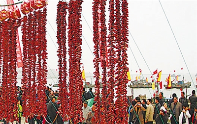 <传说> 山东青岛即墨有个田横岛,田横岛上有个田横镇。每年谷雨前后,渔民们在修船、添置渔具等生产准备工作就绪后,要选个黄道吉日把渔网抬上船,在出海打渔前,要祭海,称为“上网”,如同春节,这一天是即墨田横镇渔村最热闹的日子。已有500余年历史。