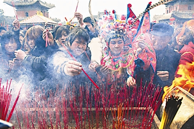 <习俗> 来太昊陵求子的人特别多。显仁殿的墙壁上有一个子孙窑,据说摸一摸就可以子孙兴旺,甚至连那些未出嫁的姑娘们也成群结队,羞羞答答去摸一摸,为的是图个吉利。婚后未孕的妇女们,则专为求子而来。她们往往要在庙会上买一个泥娃娃,用红线拴好,再到子孙窑里摸一摸,然后将泥娃娃小心翼翼地藏在衣服下面,带回家去。如果怀孕得子,则对人祖爷感恩不尽,下次庙会一定要去还愿。