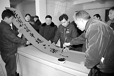 1月29日上午,河南省平煤股份六矿工会大厅,十多位矿书协会员为矿工义写春联。据了解,该矿工会组织书法家为职工义写春联已有20年传统,去年该矿安全生产成绩斐然,几万名矿工家属平安过年。图为70岁的六矿退休干部,中国书协会员宋德桢现场为职工挥毫泼墨。 陆新义 姬银岭 摄