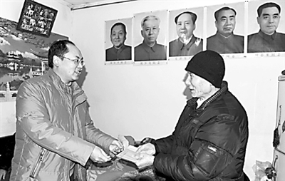 1月29日上午,中铁二局物资公司81岁高龄的全国劳模刘顺江(右)从公司工会主席何勇手中接过春节慰问金。当日,该公司两节慰问活动达到高潮,期间,公司在为离退休老职工送上慰问金和祝福的基础上,对困难职工和劳动模范进行了重点慰问。廖金文摄