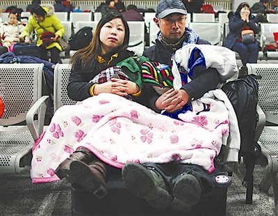 夫妻 1月24日,北京西站,一对夫妻抱着孩子在候车。韩萌 摄