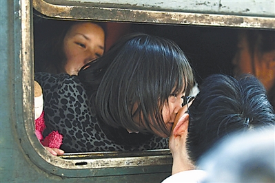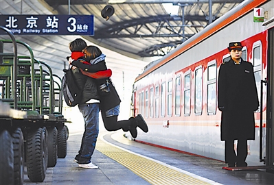 拥抱 1月26日,北京站,列车即将启程,女孩扑在送行的男友身上。韩萌 摄