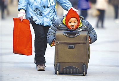 出站 1月28日,郑州市火车站广场。调皮的孩子推着行李箱前行。肖绺 摄