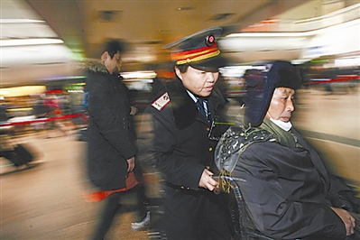 劳模 北京西站036服务队的全国劳模王凤莲帮助一位刚做完手术的旅客上车,在这个岗位工作了12年的她每天要面对成百上千人次的问询。本报记者 杨登峰 摄