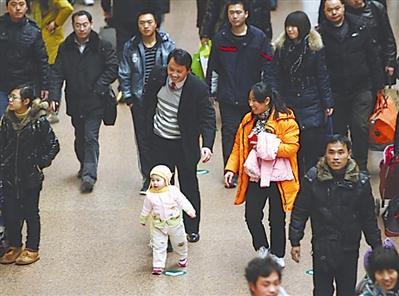 出场 1月27日,北京西站,一个小婴儿在爸妈的带领下,在候车大厅学走路。韩萌 摄