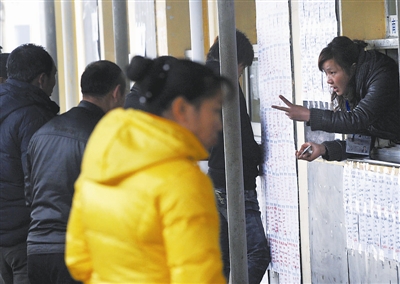 2月8日,南京安德门农民工就业市场内一职介窗口的工作人员(右)在向农民工推介岗位、招揽应聘者。