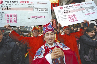 2月7日农历正月初五,是财神爷生日。民间有迎财神习俗,当日,杭州市河坊古街上演“财神送福”。由民俗演员扮演的“财神爷”,给古街上的游人及商家商铺送上元宝与新年的祝福。施健学/CFP
