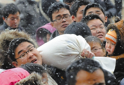 2月9日,一位旅客扛着行李挤在人流中。当日,中原地区降下今年的第一场雪。由于正值节后春运高峰,在郑州火车站站前广场和候车大厅前,都聚集了大批旅客。