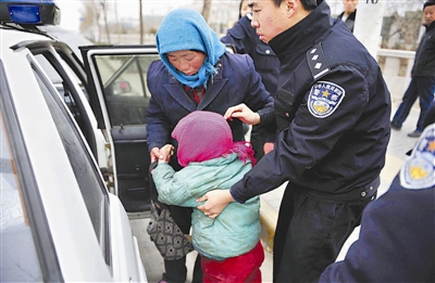 2月9日,西安市昆明路与丈八路路口,民警正把孩子抱上警车。当日,多名成年人领着孩子在此乞讨,得到报警后,西安昆明路派出所民警立即处警,带回派出所盘查。