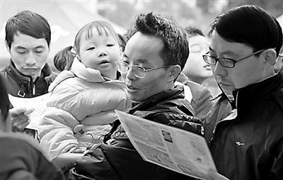 2月11日,一位男士抱着孩子在富士康招募台前询问情况。新华社记者 赵众志 摄