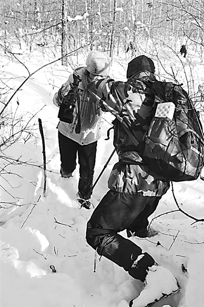 金雷是本次活动的策划者之一,同时也是迎春小分队的领队,虽然从小生长在东北,但林区的大雪还是让他吓了一跳。“根本没法走,必须有一个人在前面趟出一条路来。”金雷说,最惨的一次,一个小时只走了一公里。