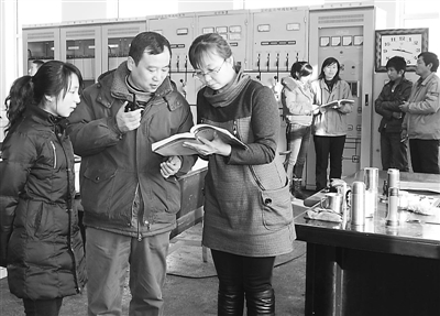 图为新能热电电厂甲值值长穆宝林(中)对下岗技术工人任小萍(左)、崔凤(右)进行工作现场技术指导。黑龙江省八五二农场新能热电有限公司是一家私营企业。在重新组建过程中,安置下岗工人328人,并在这家私营企业里组建工会,收到了很好的效果。田红 邵维信摄