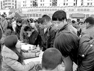 2月11日一大早,江西上犹县城茗馨广场就挤满了求职者,“2011年上犹县新春人才招聘暨‘三送’活动现场会”火热开场。作为上犹县新春伊始举办的首场大型人才招聘会,江西行田电产、赣州晨光稀土、禾普木业、天女秀内衣等110余家县内外用工单位现场参会,提供就业岗位1.13万个,近两万人到场参加应聘,现场达成用工意向1368人,当场录用313人。曾俊池 摄