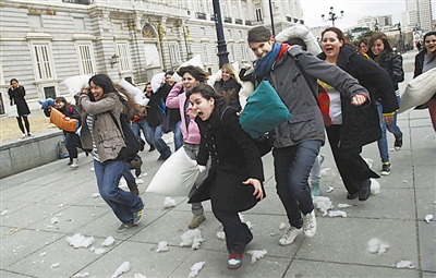 当地时间2月14日,一群“快闪族”的年轻人在西班牙首都马德里皇宫前进行了一场吸引过路人眼球的枕头大战。阿健 供图