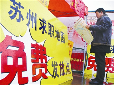 苏州相关部门将在该市火车站、汽车站等地免费发放6万份“求职地图”。该地图标出了即日起至4月底苏州陆续举行的400余个招聘会的举办时间和地点,以方便外来务工人员前往招聘会求职。 新华社发(李俊锋 摄)