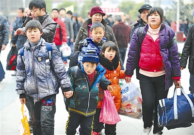 伴随着春节假期的结束,一些回乡探亲的务工人员背起行囊,踏上返城路。其中,不少“小候鸟”们也跟随父母再次踏上春运的旅途。新华社记者 郝同前 摄