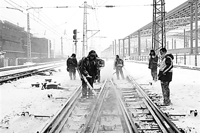 辽阳工务段针对冬季极端天气频发、风雪大的实际,依靠科技力量刨冰除雪,最大限度地减小恶劣天气对铁路运输带来的不利影响。图为近日该段职工在辽阳火车站使用风力除雪机清除道岔积雪。郎钰姝摄