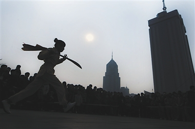 2月16日,一位小武师正在表演刀术。当日,太原市形意拳协会在太原市五一广场举办了一场武术展演,近百名老少武师各展绝技,吸引了不少市民驻足欣赏。新华社记者 范敏达 摄