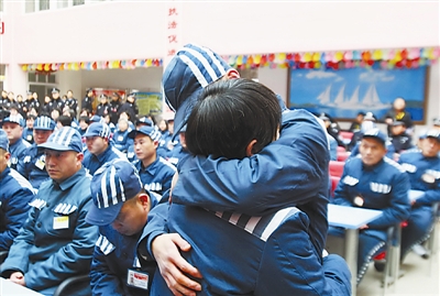 2月17日,河南省郑州女子监狱内年逾半百的李秀,紧紧抱着自己年仅20岁的儿子王亮,老泪纵横。两年前,李秀在贩卖毒品时,恰巧碰上回家的儿子,孝顺的儿子要求开车送妈妈,母子落入法网。当日,郑州女子监狱与毗邻的豫中某所监狱多次磋商,使29名有着亲属关系的服刑人员可以共度元宵佳节。王中举 摄