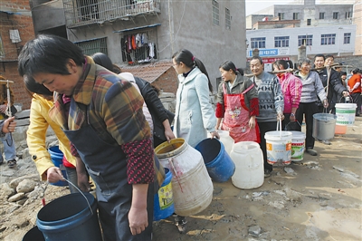 2月17日,重庆市云阳县水口集镇,居民排队领水。去冬今春以来,这里一直没有有效降雨。为此,当地政府及时组织市政和消防车送水,基本解决了集镇居民和学生的饮水问题。刘洋 摄