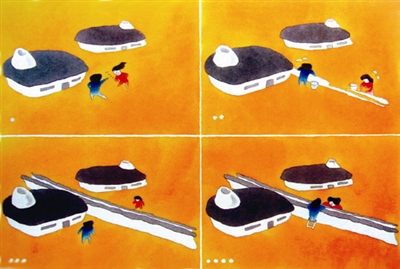有一天,不知是蓝家的鸡多看了一眼红家的狗,还是红家的狗惊了蓝家正在生蛋的鸡,后果是两位主人吵了起来。蓝大嫂这边,眼睛都气蓝了,红大嫂那边,脸都憋红了。冷静下来后,双方实施了一项节省智慧却颇费体力的方案,在完成了口水向汗水的成功转型之后,一堵造型简约但很实用的墙竣工了。这项工程驱走了烦恼,却带来了寂寞。不过,这也还难不倒姐俩,这不,蓝嫂踩着板凳冒着掉下来崴脚的危险越过墙头,与红嫂亲切地谈了起来。哎!累不累呀?