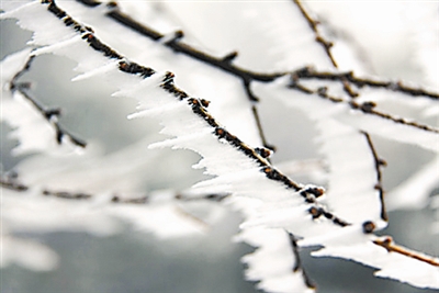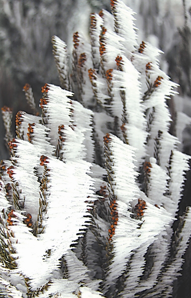 日前一场“雾凇”奇观降临安徽九华山,给“莲花佛国”添美景,让来山游客和当地居民大饱眼福。据了解,多年来,这种美丽的自然现象极为少见,“雾凇”气象学又称“冻雨”等名称,当气温在摄氏零度以下,遇到毛毛细雨或云雾飘遇山峰树木,迅速凝聚冻结而成的白色结晶体。这场新年罕见的“雾凇”奇观,使九华山漫山遍野变成玉树琼花,玲珑剔透,一片琉璃世界,令人眼花缭乱。