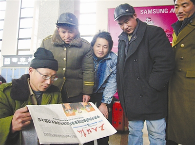 在北京站候车室,接受本报问卷调查的农民工们正在阅读《工人日报》。本报记者 于宛尼 摄