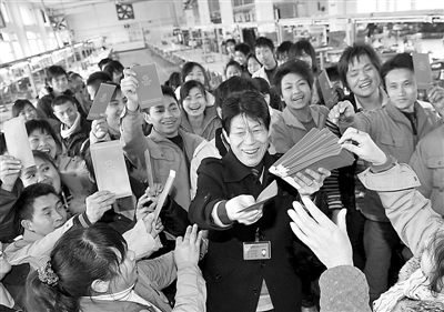 2月14日,上班第一天。上海天渡精密机械有限公司总经理冯有燃和工会主席丁惠芳到车间向每位职工拜年,看到来自四川、湖北、江苏、安徽等地的农民工全部按时上班后,很是感动,拱手向大家致谢。据悉,该公司共有职工51名,其中95%是农民工。2010年12月,企业拿出25万元组织全体职工及家属到东南亚旅游,节前还安排年夜饭为返乡农民工送行。农民工感慨地说,“企业为我们想得周到,我们要为企业多出力。”